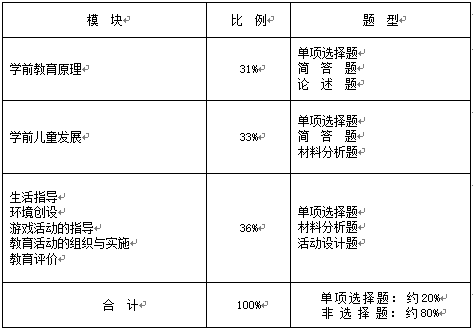 考试内容主要涵盖学前儿童发展、学前教育原理、生活指导、环境创设、游戏活动的指导、教育活动的组织与实施、教育评价等七个模块。能力要求分为了解、理解、熟悉、掌握、运用五个层次。